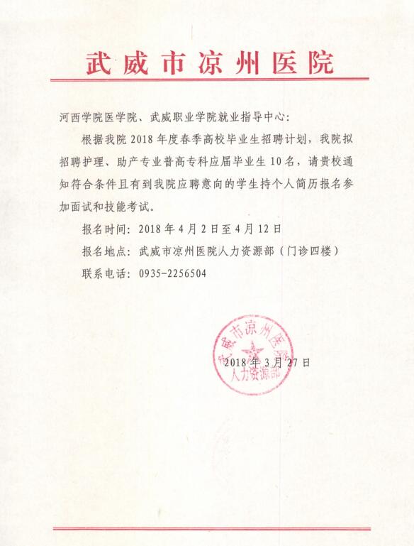 ? ? ? ?武威市涼州醫(yī)院擬招聘護(hù)理、助產(chǎn)專業(yè)畢業(yè)生10名,報(bào)名時(shí)間2018年4月2日~4月12日,報(bào)名時(shí)請(qǐng)攜帶個(gè)人簡歷,一寸彩色照片一張,請(qǐng)我系15級(jí)應(yīng)屆畢業(yè)生積極響應(yīng),踴躍報(bào)名!