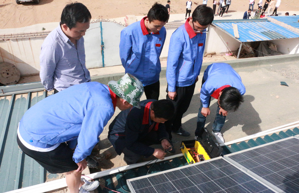 走進(jìn)圓夢(mèng)新村,由學(xué)院校辦企業(yè)武威泰豐新能源有限公司建設(shè)的200戶(hù)貧困家庭戶(hù)均3kw的分布式光伏發(fā)電系統(tǒng)映入眼簾。在社區(qū)書(shū)記郭林春的帶領(lǐng)下,黨員教師和學(xué)生入黨積極分子上門(mén)幫助用戶(hù)檢查維修光伏發(fā)電設(shè)備,檢查光伏組件的老化跡象以及所有連接器是否連接緊密、有無(wú)腐蝕現(xiàn)象,檢查組件是否接地良好。了解農(nóng)戶(hù)的需求,為農(nóng)戶(hù)講解光伏設(shè)備后期維護(hù)、電費(fèi)結(jié)算方式以及國(guó)家扶貧惠民的政策等知識(shí),并對(duì)部分農(nóng)戶(hù)屋頂光伏組件故障進(jìn)行了排除,對(duì)光伏組件進(jìn)行了大面積清潔維護(hù)。