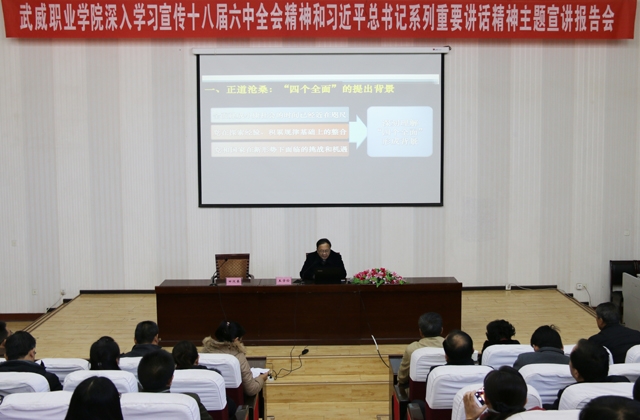 根據(jù)省委和全省宣傳工作會(huì)議關(guān)于在全省組織開展深入學(xué)習(xí)宣傳十八屆五中全會(huì)精神和習(xí)近平總書記系列重要講話精神主題宣講活動(dòng)的通知要求,為向全院黨員干部和師生宣傳好、解讀好十八屆五中、六中全會(huì)精神和習(xí)近平總書記系列重要講話的實(shí)質(zhì)內(nèi)涵和深遠(yuǎn)意義,將全會(huì)精神和總書記系列重要講話精神作為指導(dǎo)和推動(dòng)學(xué)院各項(xiàng)事業(yè)快速發(fā)展的科學(xué)理論和強(qiáng)大動(dòng)力。10月29日上午,“武威職業(yè)學(xué)院深入學(xué)習(xí)宣傳十八屆五中、六中全會(huì)精神和習(xí)近平總書記系列重要講話精神主題宣講報(bào)告會(huì)”在學(xué)院尚德樓正德廳舉行。會(huì)議邀請省委講師團(tuán)成員、蘭州大學(xué)馬克思主義學(xué)院博士生導(dǎo)師王學(xué)儉教授蒞臨學(xué)院,作題為“四個(gè)全面”戰(zhàn)略布局解讀的宣講報(bào)告。學(xué)院黨委副書記趙明,副院長王永緒、潘玉華、田迎春,全體中層干部,各部門師生代表共計(jì)260余人參加宣講報(bào)告會(huì)。報(bào)告會(huì)由田迎春主持。