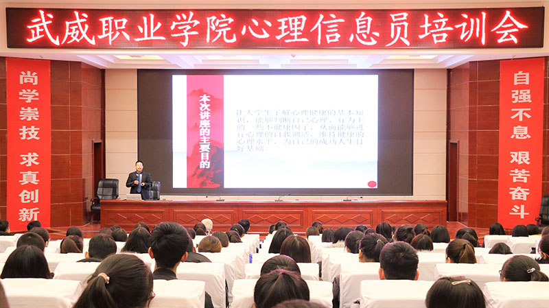 12月4日晚上,學(xué)生工作處聯(lián)合武威市“三社聯(lián)動(dòng)”惠政社區(qū)試點(diǎn)項(xiàng)目在學(xué)院菁英廳舉辦了心理健康專題講座暨心理信息員培訓(xùn)。此次講座邀請武威市心理咨詢師協(xié)會(huì)會(huì)長何飛老師主講,學(xué)院各系輔導(dǎo)員、2017級、2018級班級心理信息員、心翼心理社團(tuán)會(huì)員等220多人聆聽了講座。學(xué)生工作處處長王守云主持活動(dòng)。
