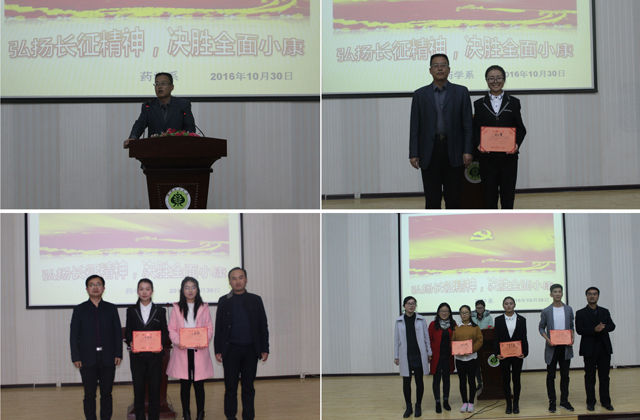 為紀(jì)念紅軍長征勝利80周年,激發(fā)師生弘揚(yáng)偉大的長征精神,同時(shí)為豐富校園文化生活,展示青春正能量,藥學(xué)系團(tuán)總支依據(jù)院團(tuán)委的通知精神和系團(tuán)學(xué)工作委員會(huì)關(guān)于增加學(xué)生課余活動(dòng)的會(huì)議要求,于10月30日在正德廳組織開展了“傳承長征精神,筑我青春夢(mèng)想”主題演講比賽。藥學(xué)系主任魏潤明出席了本次活動(dòng),各班班主任擔(dān)任本次比賽評(píng)委,2016級(jí)全體學(xué)生和2015級(jí)各班學(xué)生代表觀看了比賽。