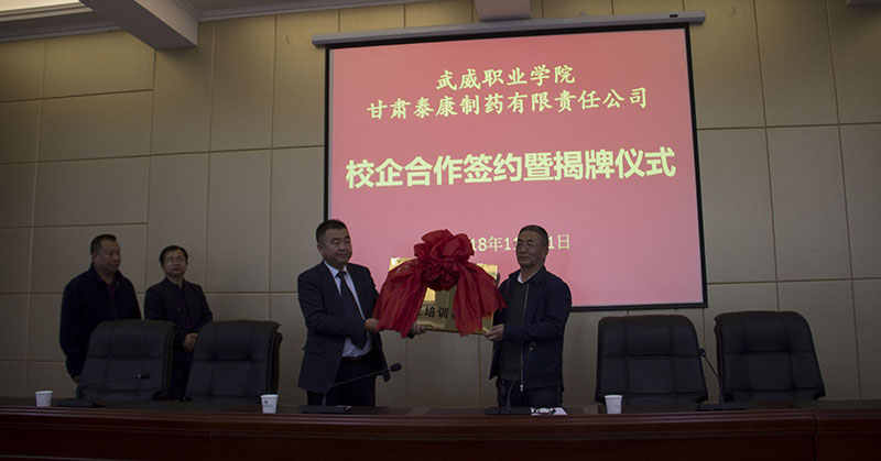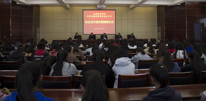 為提高人才培養(yǎng)質(zhì)量和辦學(xué)水平,加強(qiáng)校企協(xié)同育人機(jī)制建設(shè),2018年11月1日下午,藥學(xué)系與甘肅泰康制藥有限責(zé)任公司校企合作共建“就業(yè)實習(xí)基地”簽約揭牌儀式在行樹樓北側(cè)會議室隆重舉行。甘肅泰康制藥有限責(zé)任公司投資方—北京久朝集團(tuán)產(chǎn)業(yè)中心總監(jiān)楊宏超、公司總工程師毛著鴻、財務(wù)總監(jiān)郝敏等企業(yè)領(lǐng)導(dǎo)出席本次儀式。學(xué)院教務(wù)處處長仲生仁、招生就業(yè)處處長蔡柱山、藥學(xué)系主任魏潤明、副主任楊建美、黨總支副書記單光年及藥學(xué)系160余名師生參加了此次簽約揭牌儀式。儀式由魏潤明主持。