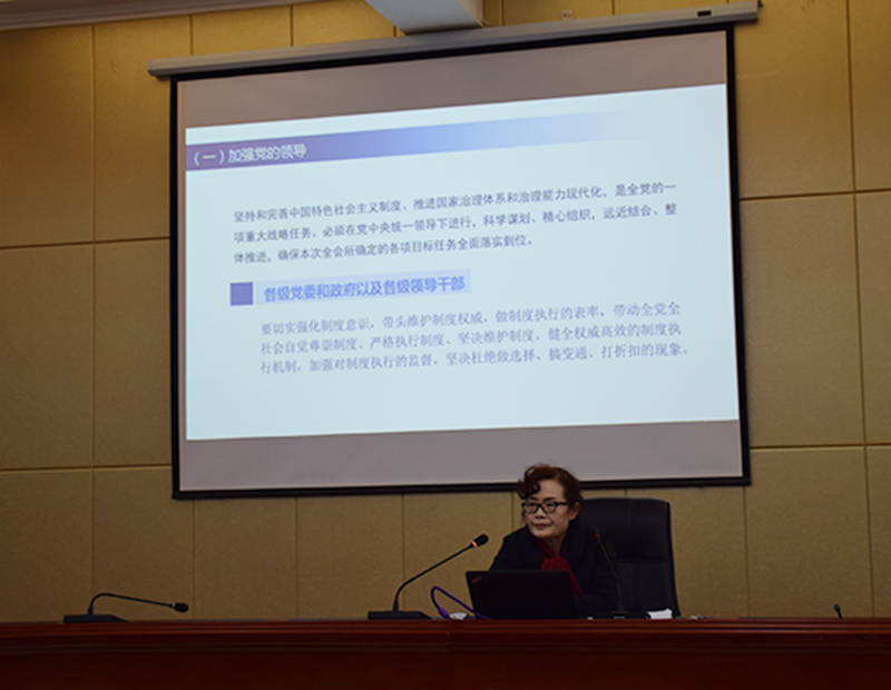 晏素珍以《中共中央關(guān)于堅持和完善中國特色社會主義制度推進國家治理體系和治理能力現(xiàn)代化若干重大問題的決定》的學習與解讀為題,重點就全會召開的背景、意義和看點;《決定》的基本框架和主要內(nèi)容以及抓好全會的學習貫徹的具體要求進行了宣講。要求廣大師生提高政治站位,樹牢“四個意識”,堅定“四個自信”,做到“兩個維護”,推動全會精神在全系落地生根、取得扎實成效。為實現(xiàn)“兩個一百年”奮斗目標,實現(xiàn)中華民族偉大復(fù)興的中國夢而努力奮斗。