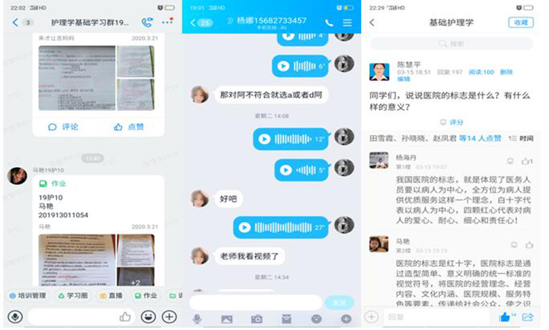 護(hù)理系通過“多平臺(tái)、多渠道”全面開展在線教學(xué),主要采取“網(wǎng)絡(luò)課程+資料推送+討論答疑+互動(dòng)直播”的線上教學(xué)模式。全系24名教師全部實(shí)施線上教學(xué),課程共計(jì)11門次,已完成授課544學(xué)時(shí)(截至3月22日)。本周教師上傳課程課件93件,上傳視頻269個(gè),根據(jù)教學(xué)任務(wù)布置課堂練習(xí)題數(shù)量為435,布置課后作業(yè)題目數(shù)量為857,本周內(nèi)教師組織開展討論、答疑的總次數(shù)為89次,學(xué)生參與答疑討論的次數(shù)為16874次。學(xué)生平均到課率95%以上。從學(xué)院教學(xué)平臺(tái)反饋數(shù)據(jù)看,本周課程訪問量達(dá)到399415,位居全院第一。