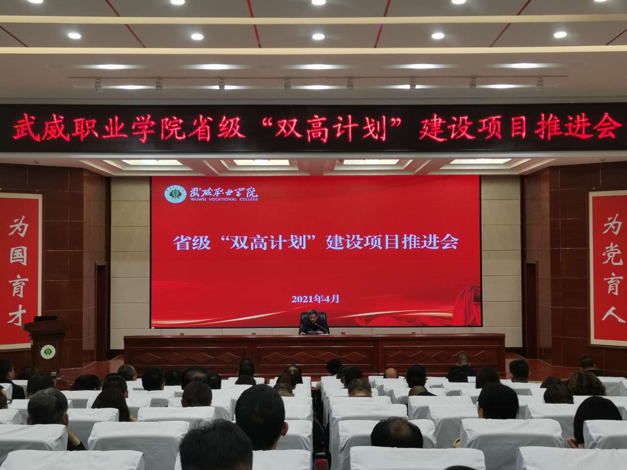 為推進(jìn)學(xué)院“雙高計(jì)劃”建設(shè)工作,4月21日下午,在大學(xué)生活動(dòng)中心菁英廳召開(kāi)了“雙高計(jì)劃”建設(shè)項(xiàng)目推進(jìn)會(huì)。學(xué)院領(lǐng)導(dǎo)班子出席了會(huì)議,副科級(jí)以上干部、項(xiàng)目組和專項(xiàng)工作組負(fù)責(zé)人、專業(yè)群負(fù)責(zé)人、項(xiàng)目組成員等共計(jì)220余人參加了會(huì)議。會(huì)議由黨委副書(shū)記翟存祥主持。
