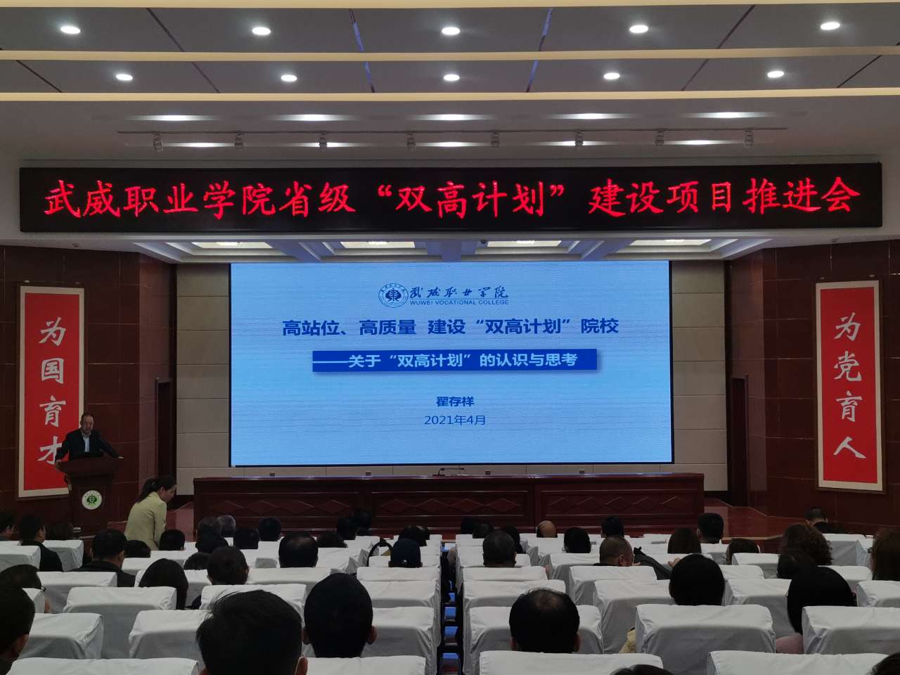 黨委書(shū)記、院長(zhǎng)趙明在講話中指出,習(xí)近平總書(shū)記的重要指示和李克強(qiáng)總理的批示,為我們奮力構(gòu)建高質(zhì)量職業(yè)教育體系指明了方向。學(xué)院成功入選省級(jí)“雙高計(jì)劃”建設(shè)單位,是學(xué)院發(fā)展歷程上的又一里程碑,為學(xué)院高質(zhì)量發(fā)展注入了新動(dòng)能,帶來(lái)了新機(jī)遇。我們既為前期工作成效感到欣喜,也要認(rèn)清當(dāng)前形勢(shì)和未來(lái)發(fā)展的壓力與緊迫感,抓住這次契機(jī),提升自身硬實(shí)力和軟實(shí)力。在未來(lái)幾年,把“雙高計(jì)劃”建設(shè)作為學(xué)院的中心工作和改革發(fā)展的政治任務(wù)。他提出五點(diǎn)工作要求,一是要充分發(fā)揮黨組織的戰(zhàn)斗堡壘作用。以習(xí)近平新時(shí)代中國(guó)特色社會(huì)主義思想為指導(dǎo),加強(qiáng)黨對(duì)“雙高計(jì)劃”建設(shè)項(xiàng)目的全面領(lǐng)導(dǎo),以一流黨建引領(lǐng)高水平建設(shè),切實(shí)把黨建工作與項(xiàng)目建設(shè)同部署、同落實(shí)、同考評(píng)。二是要加強(qiáng)領(lǐng)導(dǎo),強(qiáng)化責(zé)任?!半p高計(jì)劃”的建設(shè)不能寫(xiě)在紙上,講在嘴上,而要落實(shí)在行動(dòng)上,所有領(lǐng)導(dǎo)干部要提高擔(dān)當(dāng)意識(shí)、服務(wù)意識(shí)、發(fā)展意識(shí),立足當(dāng)前,著眼長(zhǎng)遠(yuǎn),攻難克堅(jiān),為學(xué)校“雙高”建設(shè)做貢獻(xiàn)。三是要加強(qiáng)融合,提升工作效能。將“雙高計(jì)劃”建設(shè)與提質(zhì)培優(yōu)、技能甘肅等重點(diǎn)工作融入日常,同步謀劃、一體推進(jìn),確保項(xiàng)目建設(shè)有序進(jìn)行。對(duì)標(biāo)國(guó)家高水平院校和高水平專業(yè)群進(jìn)行高標(biāo)準(zhǔn)謀劃,完善高水平成果培育機(jī)制,主動(dòng)提標(biāo)、自我加壓,持續(xù)發(fā)力、持續(xù)攻堅(jiān),形成更多更好的成果。四是要改革創(chuàng)新,加強(qiáng)績(jī)效管理。進(jìn)一步加強(qiáng)制度建設(shè),持續(xù)創(chuàng)新管理體系、完善管理制度、創(chuàng)新管理辦法,規(guī)范辦事流程,完善績(jī)效考核辦法,切實(shí)增強(qiáng)績(jī)效考核的導(dǎo)向性、方向性、引領(lǐng)性,激發(fā)廣大教職員工參與“雙高計(jì)劃”建設(shè)的積極性、主動(dòng)性。五是健全督導(dǎo)機(jī)制,加強(qiáng)監(jiān)管。通過(guò)開(kāi)展定期或不定期、形式多樣的督查工作,切實(shí)加強(qiáng)管理,推動(dòng)任務(wù)落實(shí)。