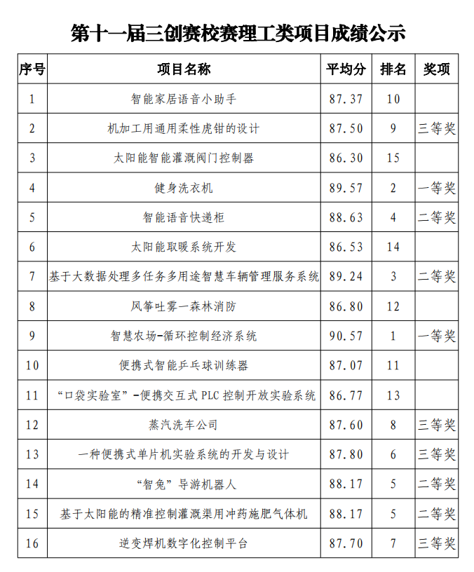按照第十一屆三創(chuàng)賽省賽組委會(huì)要求,學(xué)院于4月24日在創(chuàng)新創(chuàng)業(yè)中心舉辦了校賽,經(jīng)學(xué)生團(tuán)隊(duì)申報(bào)、現(xiàn)場(chǎng)答辯及專家評(píng)審環(huán)節(jié),校賽已圓滿完成。按照校賽方案,一等獎(jiǎng)不超過(guò)參賽隊(duì)數(shù)的 10%,二等獎(jiǎng)不超過(guò)參賽隊(duì)數(shù)的 20%,三等獎(jiǎng)不超過(guò)參賽隊(duì)數(shù)的 30%?,F(xiàn)將第十一屆三創(chuàng)賽校賽獲獎(jiǎng)項(xiàng)目成績(jī)和獲獎(jiǎng)名次予以公示,公示期三日。