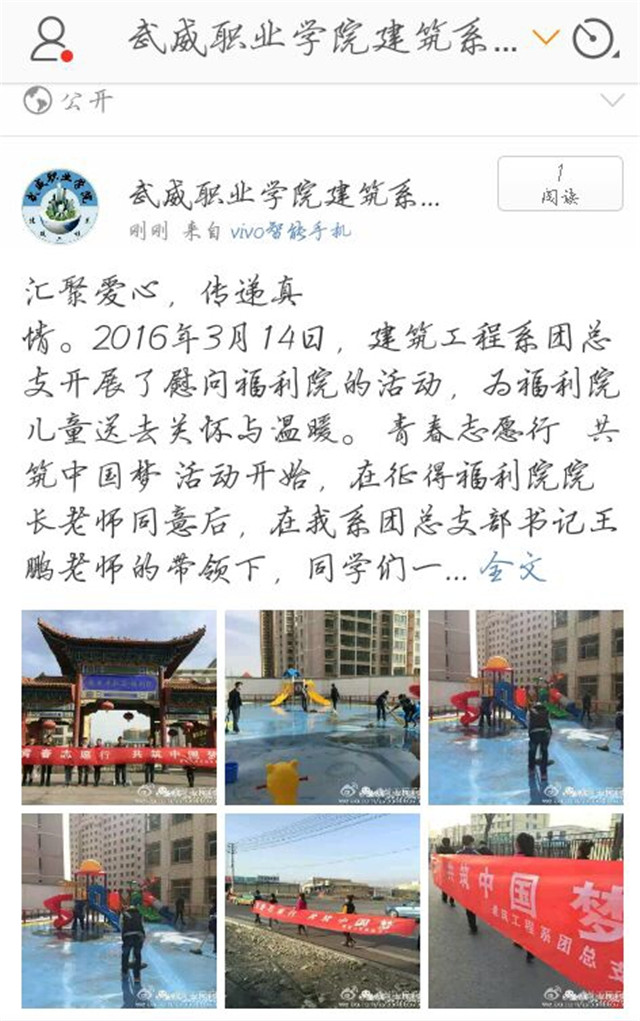 一是建筑系團總支組織10名青年志愿者走進武威社會福利院開展志愿服務活動。志愿者們走進教室和孩子們聊天互動、做游戲,清掃、整理幼兒廣場,展示了我系志愿者的青春風采,使孩子們和青年學生真正感受到雷鋒活在當代、活在身邊。