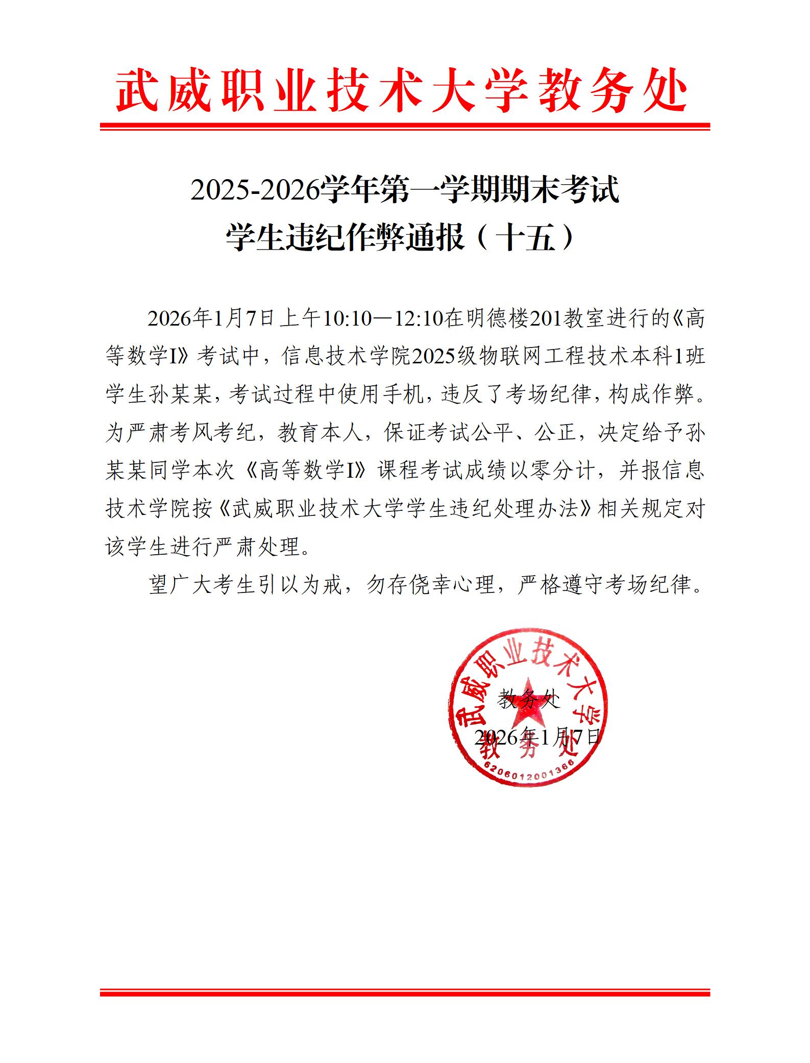 2025-2026學年第一學期期末考試學生違紀作弊通報(十五)
