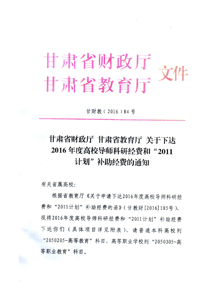 甘肅省教育廳關(guān)于下達(dá)2016年度甘肅省高等學(xué)校科研項(xiàng)目自籌經(jīng)費(fèi)項(xiàng)目的通知