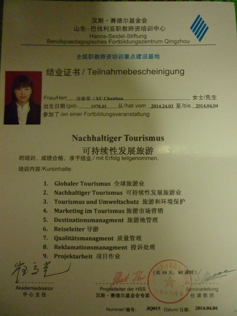 2014年3月24日至4月4日,我院旅游管理專業(yè)骨干教師馬靜、許春華參加了德國漢斯·賽德爾基金會(Hanns Seidel Stiftung)在酒泉職業(yè)技術(shù)學(xué)院舉辦的“可持續(xù)性發(fā)展旅游”師資培訓(xùn)班。