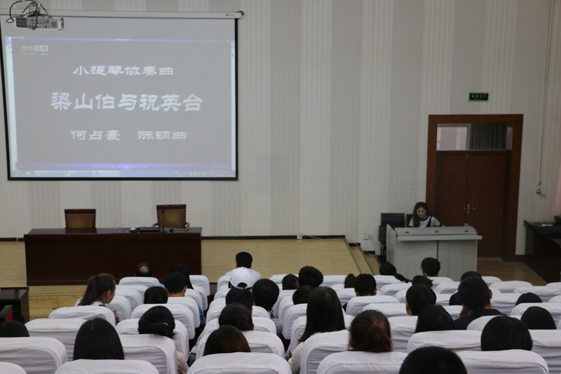 伴著優(yōu)美的音樂旋律王敏副教授開始了講座,王老師首先介紹了音樂發(fā)展歷史和音樂鑒賞的基礎(chǔ)知識,然后以我國著名作曲家陳鋼、何占豪先生創(chuàng)作的小提琴協(xié)奏曲《梁山伯與祝英臺》為題材,分階段講述了“鳥語花香”、“草橋結(jié)拜”、“英臺抗婚”、“投墳化蝶”等內(nèi)容和藝術(shù)場景。剖析了作品在管樂、和以小提琴、大提琴為主的弦樂及民樂有機(jī)結(jié)合的高超藝術(shù)境界,講座過程中王老師結(jié)合《梁?!穮f(xié)奏曲音視頻資料,演繹了梁山伯與祝英臺凄美的愛情故事。