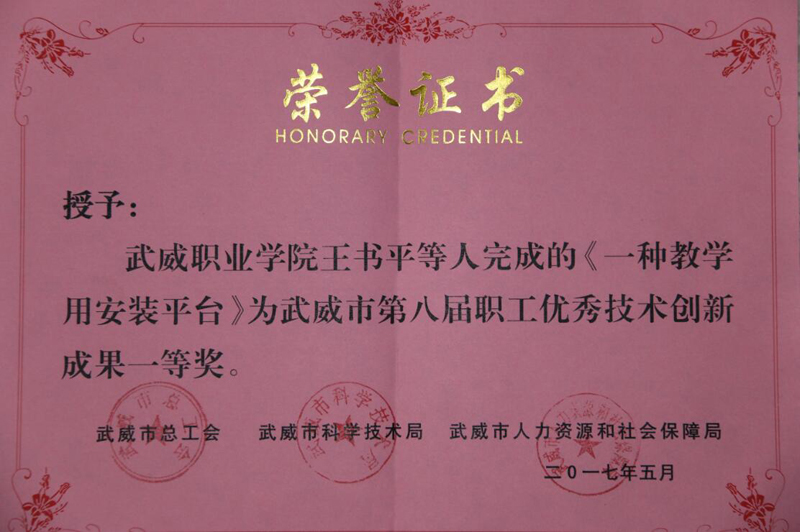 為貫徹落實武威市委、市政府關(guān)于《武威市十萬職工職業(yè)技能素質(zhì)提升活動工作方案(2016-2020年)》(武政辦發(fā)〔201672號)文件精神,推動我市“雙創(chuàng)”工作的深入開展,激發(fā)我市廣大企事業(yè)職工提升技能和開拓創(chuàng)新的熱情。近日,由市總工會、市人社局、市科技局等單位聯(lián)合舉辦了“武威市第八屆職工技術(shù)創(chuàng)新成果評選活動”。本屆職工技術(shù)創(chuàng)新成果評選共征集創(chuàng)新成果87項,其中:學(xué)院推薦了十項研究課題、專利技術(shù)項目,王書平團隊《一種教學(xué)用安裝平臺》項目成果榮獲一等獎,申賓德團隊《簡易焊工考試用帶坡口鋼板火焰切割下料機的研究與應(yīng)用》,王勝團隊《“胰美舒”治療2型糖尿病周圍神經(jīng)病變(氣陰兩虛兼瘀證)的臨床觀察》項目成果榮獲三等獎。