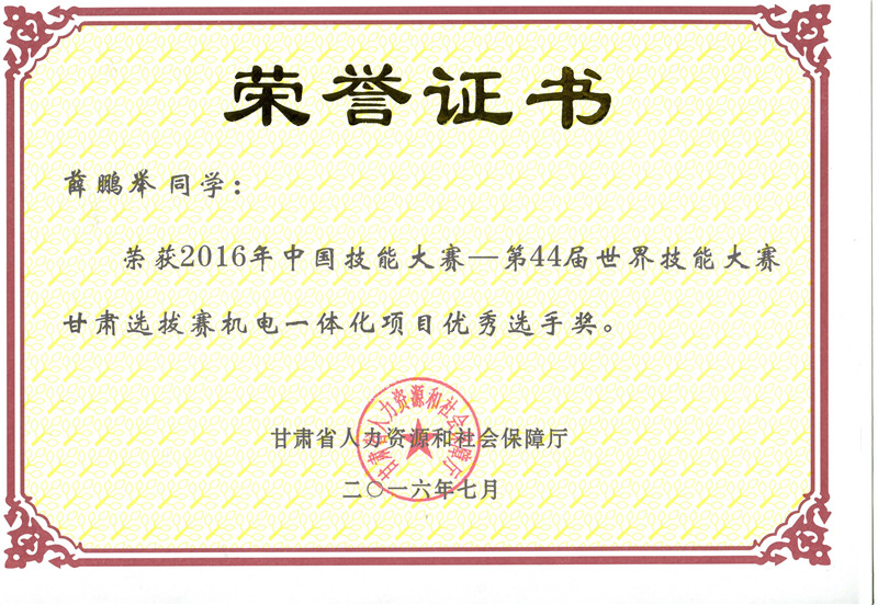 2016年中國技能大賽甘肅選拔賽機(jī)電一體化技術(shù)項(xiàng)目優(yōu)秀獎