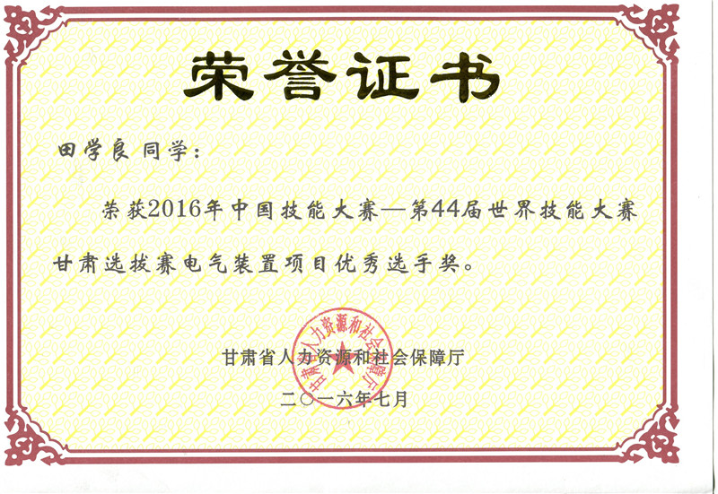 2016年中國技能大賽甘肅選拔賽電氣裝置項(xiàng)目?jī)?yōu)秀獎(jiǎng)